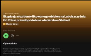 Trudno w tej chwili powiedzieć, czy reakcja służb była w pełni adekwatna. Na pewno wiadomo, że miejsce zdarzenia jest dobrze zabezpieczone – mówi Janusz Janiszewski, ekspert rynku lotniczego. Wiemy, że systemy radarowe, obrony powietrznej i identyfikacji zagrożonego powietrznego nie wykryły żadnego ruchu czy też żadnego niezidentyfikowanego statku powietrznego w okresie nocnym. Natomiast z najnowszych wiadomości, jakie chyba wszyscy śledzimy, wynika fakt, który podaje Rzeczpospolita, że najprawdopodobniej polską przestrzeń powietrzną naruszył dron typu Shahed 136, czyli najbardziej popularny statek powietrzny, bezzałogowy statek powietrzny używany w wojnie w Ukrainie przez Federacji Rosyjskiej