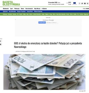 – Jak wynika z treści tej petycji, podstawowym oczekiwaniem jej autora jest zapewnienie dochodów na emeryturze niepracującym zawodowo matkom wychowującym przez całe życie dzieci. Narzędziem do tego ma być wprowadzenie czegoś na kształt dochodu gwarantowanego za każde urodzone dziecko. Jest to bardzo hojna i prospołeczna propozycja – komentuje dr Marcin Wojewódka z Instytutu Emerytalnego, cytowany przez „Fakt”.